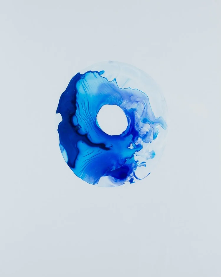 CMCC: This work, Awakening, obviously contains a lot of blue which to me, means something spiritual. Many people call these the donut paintings which I think is pretty funny. They are actually supposed to be loops with holes in the middle. Representing the frustrating hole at the center of our being, this work not only highlights what is "missing" from our bodies but also physically our skin has a hole in the middle which has tubes that lead to more holes. All of our body has another space for something else. I enjoying making loops to represent that.