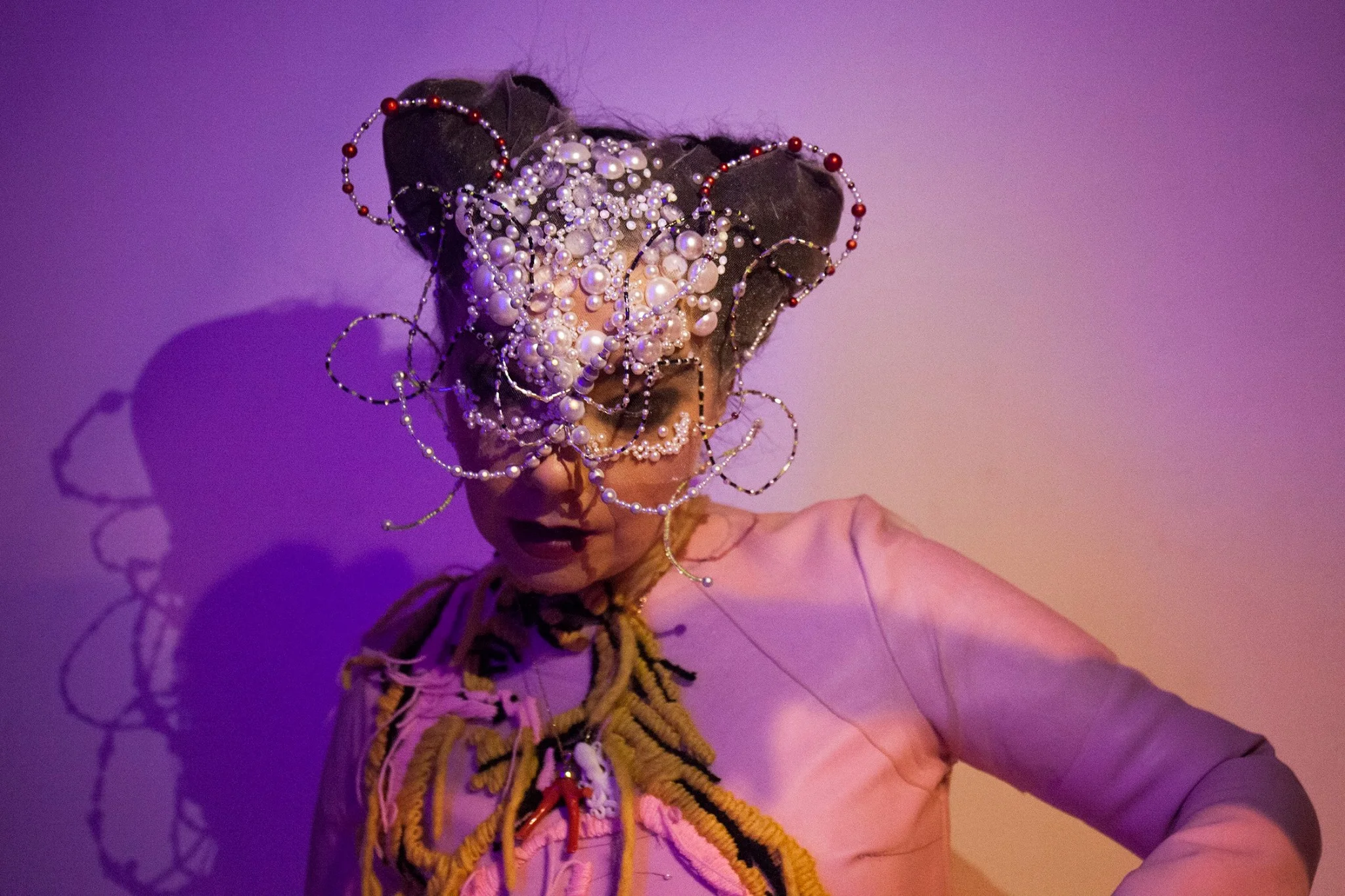 In her work, Arnardóttir addresses the history of our obsession with hair and how it is an ongoing manifestation of creativity in contemporary culture. The work is often interwoven with performance on where she plays with the allure of the excessive, ranging from decorative and beautiful to haunting and horrific. The headpiece she created for Björk on her album cover of Medúlla in 2004 was on view at the Museum of Modern Art, MoMA in New York as apart of the Björk retrospective.